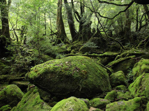 | 巨木のヤクスギを見たり、くぐったりと、森の中を歩いていくと、苔の広がる場所「苔むす森」へと到着 | |